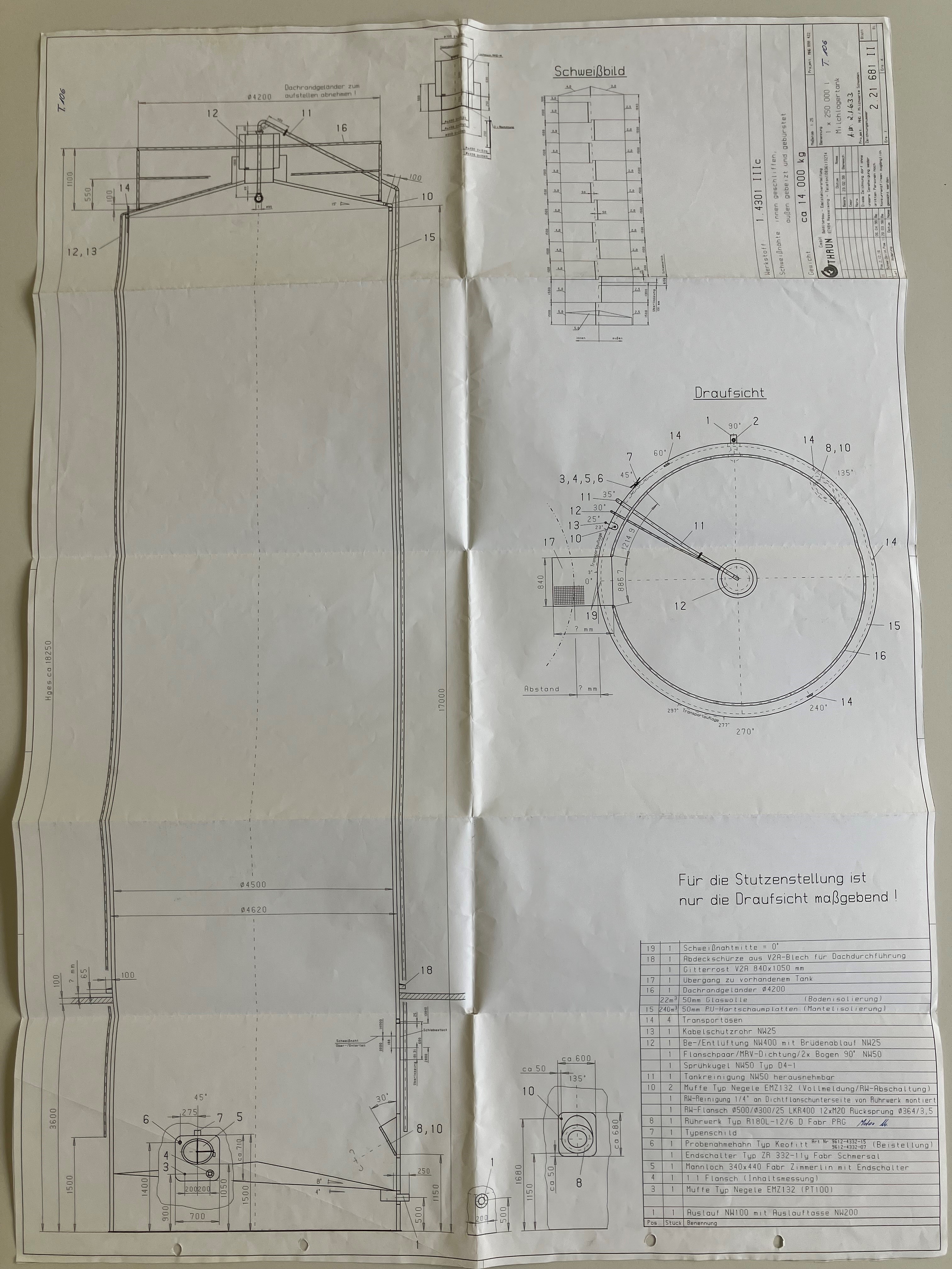 Behälter 250.000 Liter aus V2A isoliert, gebraucht - Preis auf Anfrage - besteht aus dem Material 1.4301(AISI304) V2A. Das Volumen beträgt ca. 250.000,00 Liter. Der Durchmesser innen umfasst 4.500 mm. Behälter 250.000 Liter aus V2A isoliert, gebraucht - Preis auf Anfrage - wurde zuletzt im folgenden Bereich eingesetzt: Lebensmittel. Aktuell sind von Behälter 250.000 Liter aus V2A isoliert, gebraucht - Preis auf Anfrage - noch 1 Stück verfügbar. Die Lieferung kann weltweit stattfinden.